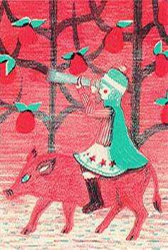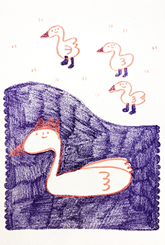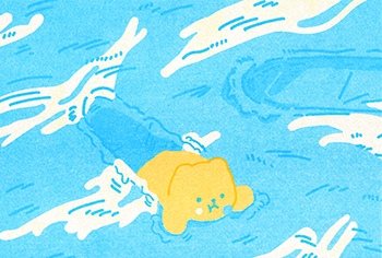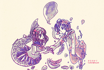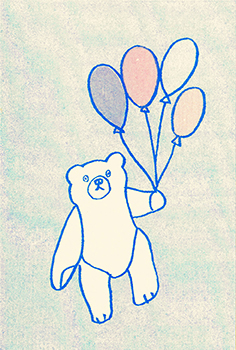 こぐまとおんなのこが、仲良く手をつないで見つめ合っています。見た人が優しい気持ちになるよう意識して描きました。