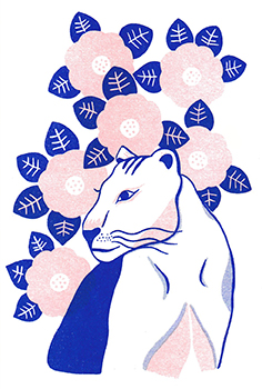 アナログでアジのあるズレる可愛さを印刷で表現しました。重ね捺しできる消しゴムはんこがそれを表現するのにピッタリだと思い、細かいパーツを作り仕上げました。今回は金色がテーマの作品を制作しました。
